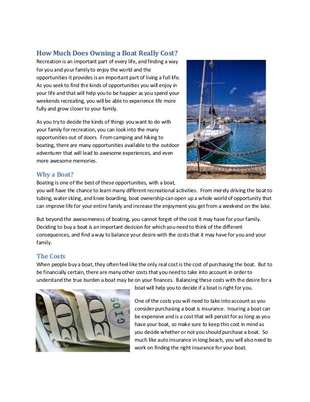 What does it cost to own a yacht? Catamarans tend to be more spacious and offer more amenities than monohulls of the same size, which means a higher sailboat price. Buying a boat in florida is just part of the cost. Standard costs of owing a sailboat maintenance costs : That's what it can cost to finance a compact family runabout or pontoon boat, and a new personal watercraft can be financed for less than $200 a month. In fact, some items are cheaper these days. The general rule of thumb that i have found is that you will pay 1.5% of the boat's value, every year. On average a new, fully equipped, fishing boat in the 16 to 20 foot range with an outboard motor, trailer and standard features will cost between $18,000 and $45,000 depending on the make and model. Leaving us with $6,500 for immediate updates. On average though, you'll be dealing with an $18,000 to $45,000 price range. You should know that the cost of boat ownership goes beyond the purchase price and depends on what type of boat you have. Additional expenses like insurance, licensing, maintenance and fuel can add up to well over $100 a month for the life of the boat. If you are borrowing money to buy your new boat, you should look into how much your monthly payments will cost and make sure they do not pass your.